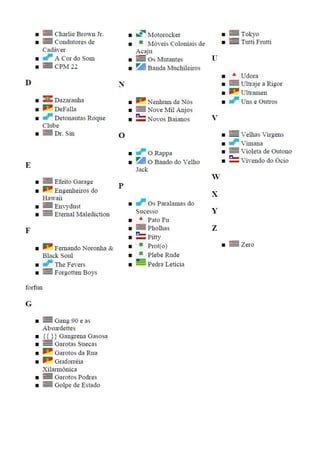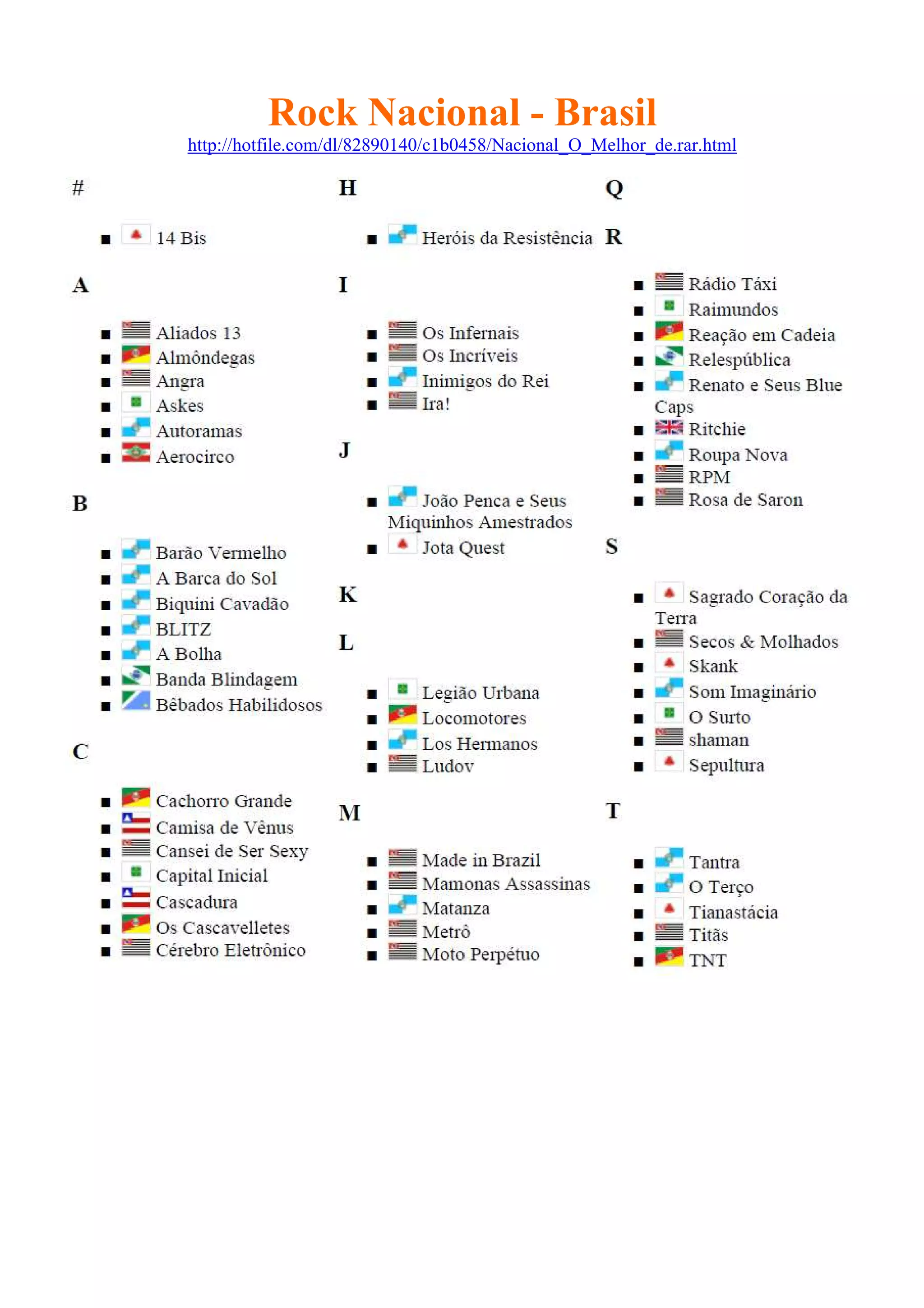 O documento lista vários links para coletâneas de rock nacional brasileiro, incluindo compilações de artistas populares como Charlie Brown Jr, Raimundos, Skank, Titãs, Barão Vermelho e CPM 22. As coletâneas contêm músicas de estilos como rock, pop rock e reggae e cobrem um período de vários anos, desde os anos 80 até 2010. Os links levam a downloads de álbuns completos em formatos como MP3 e RAR.