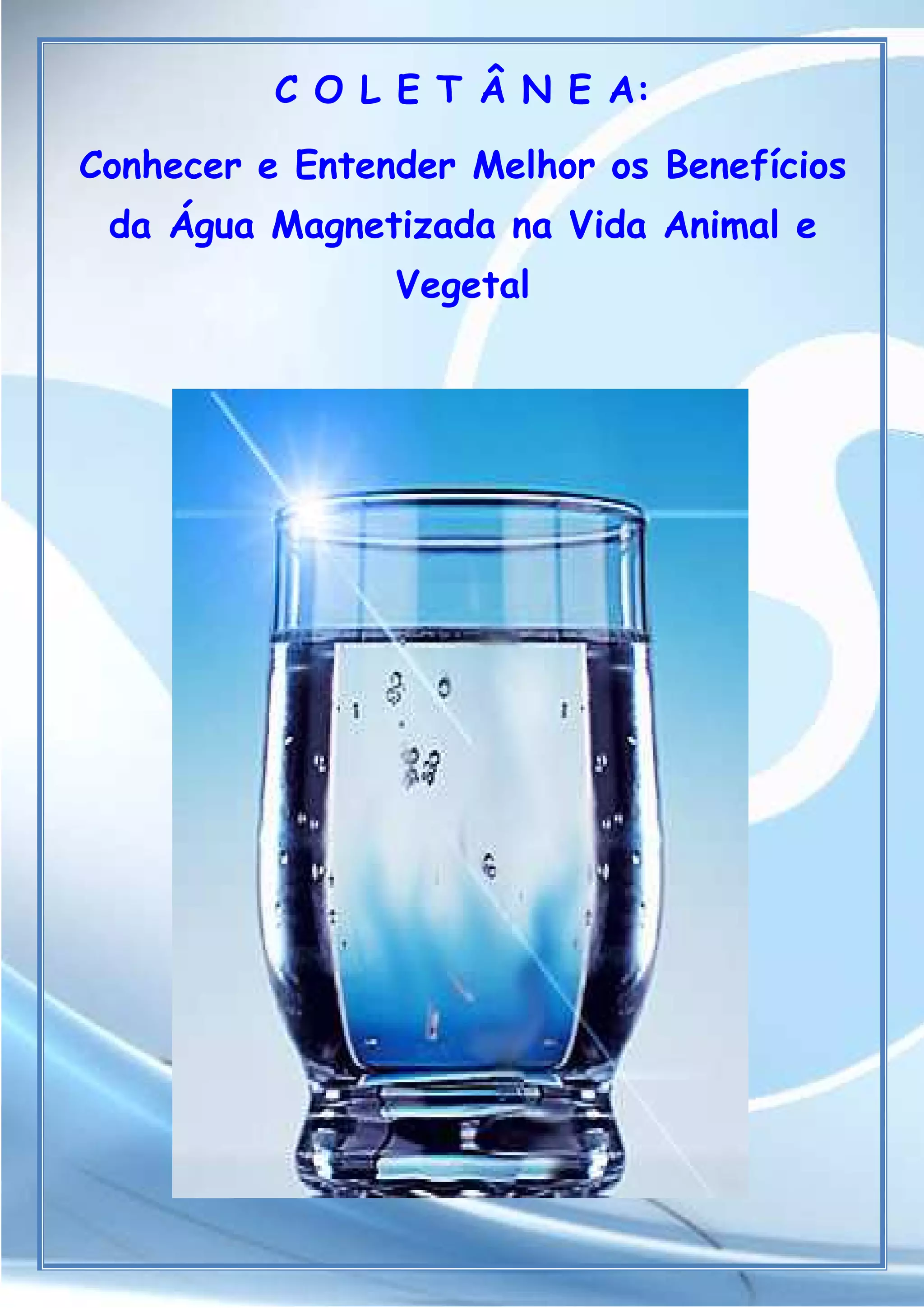 O documento discute os benefícios da água magnetizada para a saúde humana e vegetal. Apresenta estudos que mostram que a água magnetizada pode tratar doenças como diabetes, câncer e problemas renais. Também discute como a água magnetizada pode melhorar a agricultura ao aumentar a produtividade de plantas e animais.