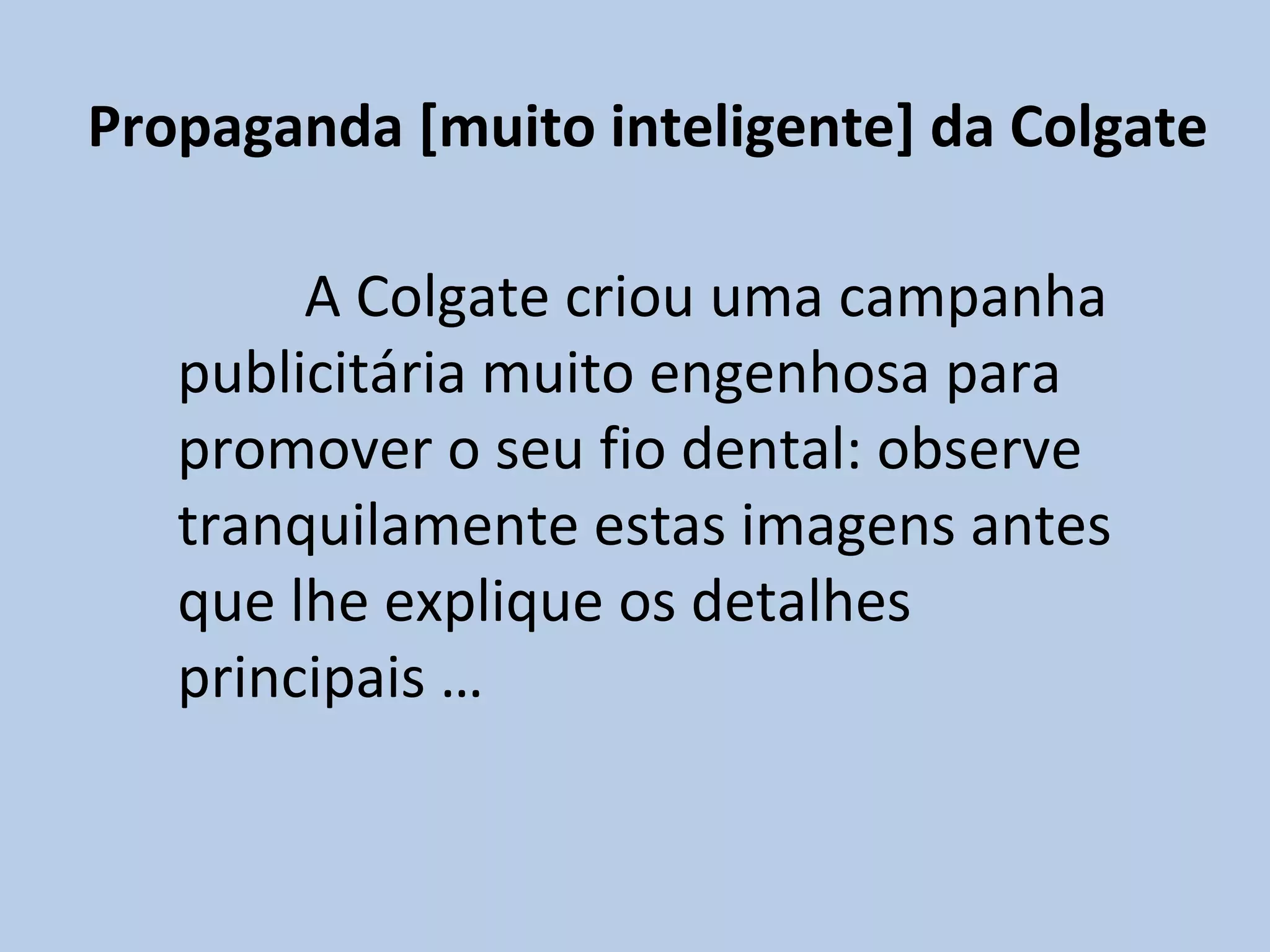 A Colgate criou uma campanha publicitária inteligente usando imagens com detalhes propositais para testar se os consumidores notariam defeitos físicos ou restos de comida nos dentes; os consumidores focaram nos dentes, mostrando que restos de comida chamam mais atenção do que defeitos físicos, cumprindo o objetivo da campanha de promover a limpeza dental.