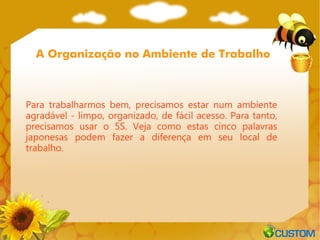 O documento discute a importância da organização no ambiente de trabalho através da metodologia 5S. Ele enfatiza que trabalhar em um local organizado e limpo pode melhorar a produtividade e o rendimento dos funcionários, já que itens como ferramentas e documentos podem ser encontrados com mais facilidade. O documento também rebate a ideia de que ambientes desorganizados indicam alta produtividade, argumentando que é possível manter bons níveis de produção ao mesmo tempo em que se cuida da organização do local de trabalho.