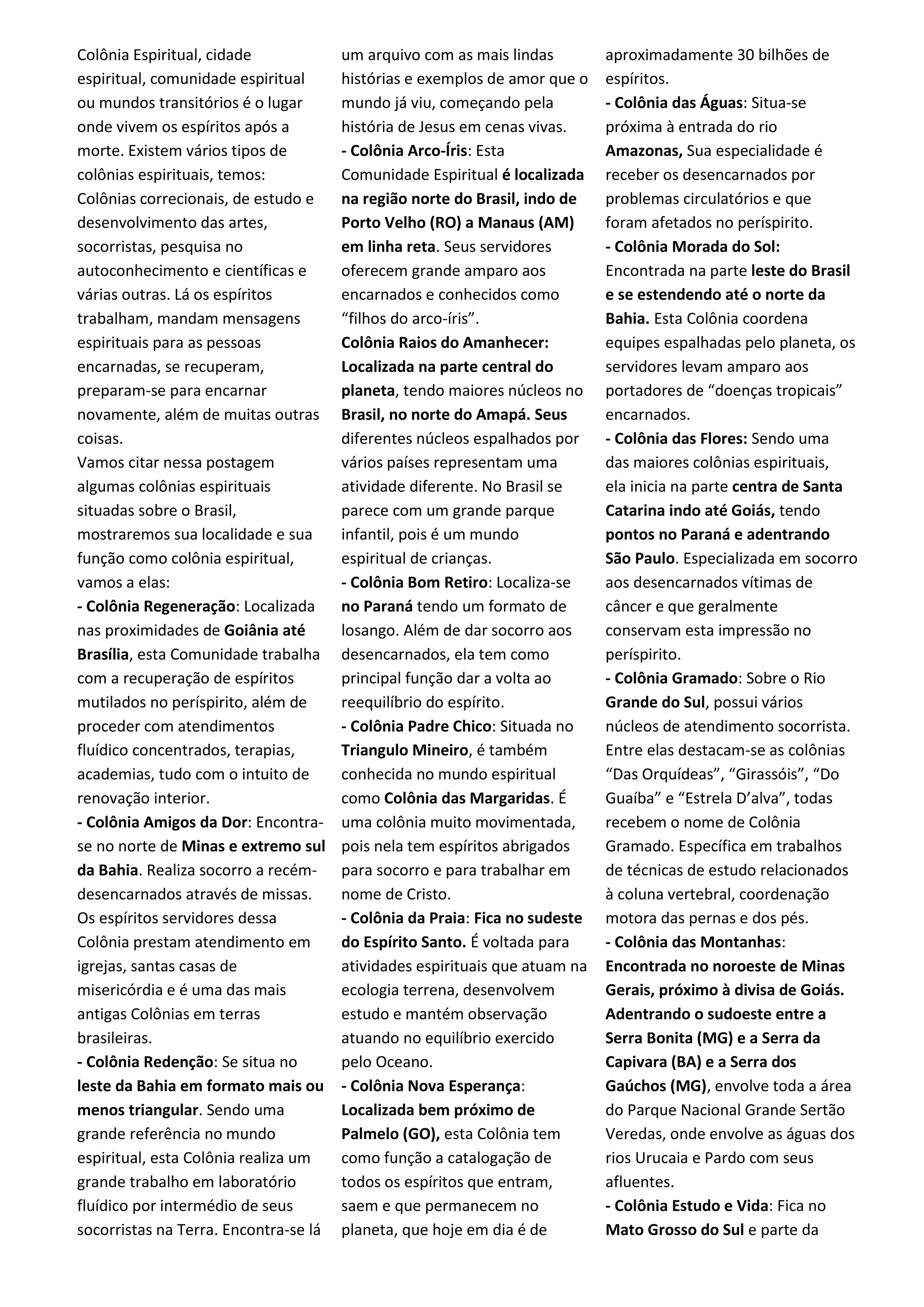 O documento descreve várias colônias espirituais localizadas no Brasil onde os espíritos vivem após a morte. As colônias fornecem serviços como recuperação, preparação para nova encarnação, socorro aos recém-falecidos e pesquisa espiritual. Algumas colônias específicas mencionadas incluem a Colônia Regeneração em Goiás, a Colônia Amigos da Dor em Minas Gerais e Bahia, e a Colônia das Flores entre Santa Catarina e Goiás.