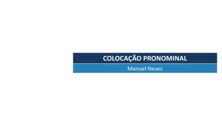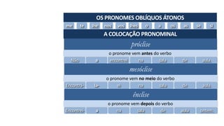 Este documento discute a colocação pronominal no português brasileiro. Explica que os pronomes podem vir antes, no meio ou depois dos verbos, dependendo do tipo de verbo e de outros fatores gramaticais. Também fornece exemplos de frases corretas e incorretas de colocação pronominal.