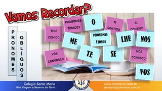 O documento explora a colocação pronominal na língua portuguesa, destacando como a gramática normativa estabelece regras e como autores se posicionam sobre elas em diferentes contextos. Discute-se a utilização de pronomes átonos e os desvios que podem ocorrer na linguagem informal, enfatizando a adequação e a ambiguidade. Diversos exemplos e questões são apresentados para ilustrar a aplicação correta das regras de colocação pronominal.