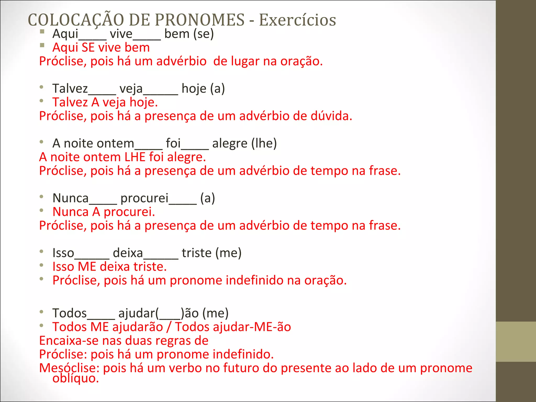 O documento fornece exemplos de colocação de pronomes oblíquos em frases com verbos no infinitivo, gerúndio ou futuro, com a explicação da regra de próclise, mesóclise ou ênclise aplicada em cada caso. As regras dependem da presença de advérbios, pronomes indefinidos, relativos ou vírgulas na frase.