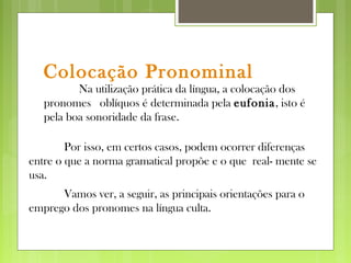 O documento discute as principais orientações para o uso correto dos pronomes oblíquos na língua portuguesa, incluindo a colocação desses pronomes em relação ao verbo (próclise, mesóclise ou ênclise) dependendo de fatores como tipo de frase ou tempo verbal.
