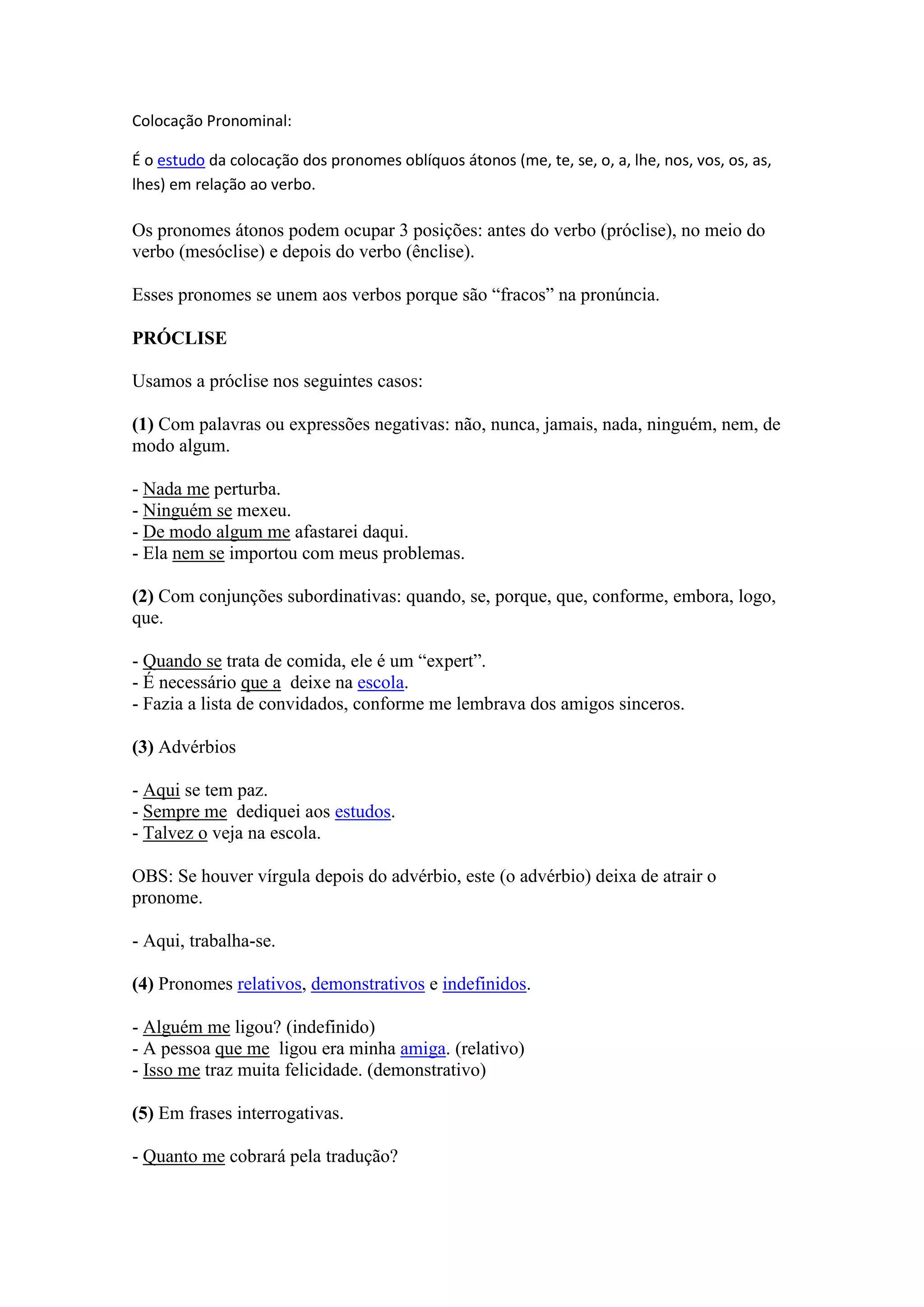O documento discute a colocação pronominal em português. Explica que os pronomes átonos podem assumir três posições em relação ao verbo - próclise, mesóclise ou ênclise - e lista regras para determinar qual posição é usada em diferentes contextos gramaticais. Também fornece exercícios sobre o tema com gabarito de respostas.