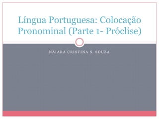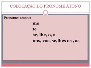 O documento discute as regras de colocação pronominal em português, especificamente a próclise. Ele explica que os pronomes átonos podem vir antes, depois ou no meio do verbo e lista as condições que exigem a próclise, como palavras negativas, pronomes relativos, conjunções e advérbios. Além disso, fornece exemplos para ilustrar cada regra.