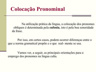 1) O documento discute as regras gramaticais para a colocação pronominal em português.