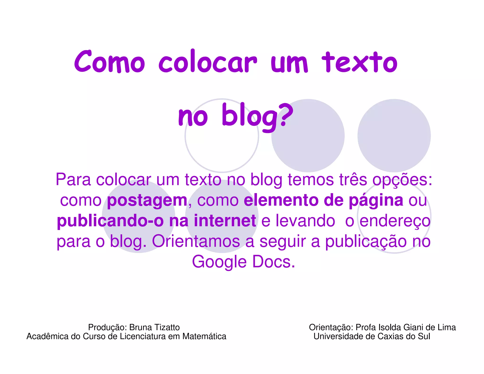 Há três opções para colocar um texto no blog: como postagem, elemento de página ou publicando-o na internet e inserindo o link no blog. O documento recomenda publicar o texto no Google Docs.