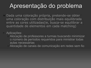 O documento descreve um algoritmo para equilibrar uma coloração de arestas de um grafo, de modo que cada cor seja utilizada aproximadamente da mesma quantidade de vezes. Ele define equilíbrio como usar cada cor entre o piso e o teto da divisão do número de arestas pelo número de cores. O algoritmo implementa caminhos de Kempe para trocar cores entre matchings adjacentes até alcançar uma coloração equilibrada.