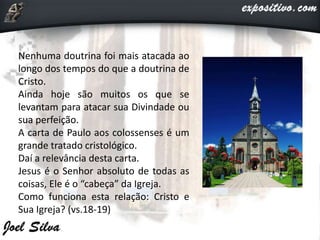 O documento discute a relação entre Cristo e Sua Igreja. Afirma que Cristo é a cabeça da Igreja, sendo sua fonte, origem e governante. Também é o vencedor da morte através de Sua ressurreição, dando vida à Igreja. Nele habita toda a plenitude divina. O texto também aborda a reconciliação proporcionada por Cristo entre Deus e os homens, tendo seu alcance no universo todo e trazendo santidade, inocência e liberdade aos crentes.