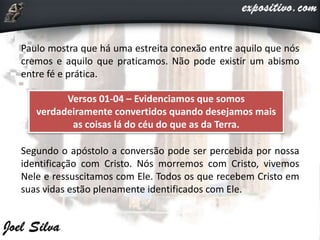 O documento discute a conexão entre fé e prática na vida cristã, enfatizando que a verdadeira conversão implica uma busca pelas coisas do céu em detrimento das do mundo. Paulo destaca que os convertidos devem mortificar a natureza terrena, abandonar práticas pecaminosas e se revestir do novo homem em Cristo. A identidade em Cristo transforma a vida do crente, que é chamado a viver de acordo com novos padrões espirituais.