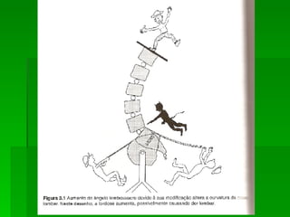 O documento discute lombalgia e hiperlordose lombar. Ele fornece informações sobre as causas, incluindo vícios posturais, maus hábitos de dormir e falta de flexibilidade muscular. Também discute o tratamento com analgésicos, compressas frias, calor, massagens e exercícios para fortalecer a musculatura abdominal e alongar os músculos lombares.