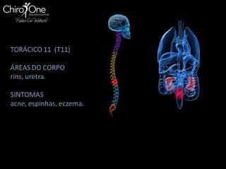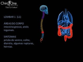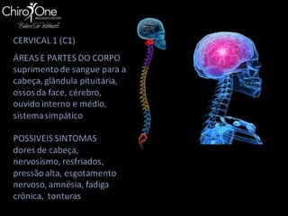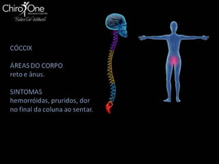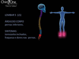 A coluna vertebral conecta-se a várias partes do corpo. Quando fora do alinhamento, pode causar vários sintomas, como dores musculares e de cabeça. O documento lista quais estruturas estão ligadas a cada vértebra e sintomas comuns de desalinhamento vertebral.