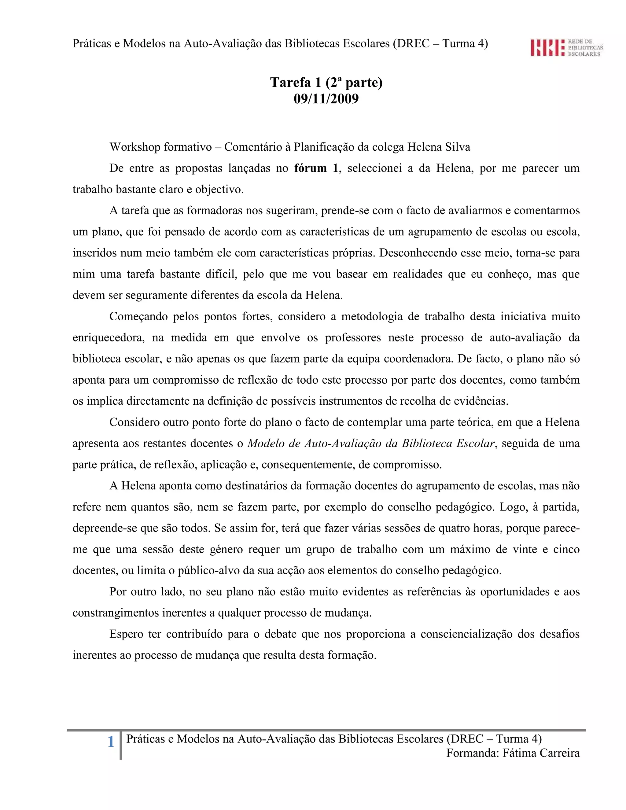 Este documento resume um comentário a um plano de autoavaliação de bibliotecas escolares desenvolvido por Helena Silva. O comentário elogia o envolvimento de professores no processo e a abordagem teórico-prática. Sugere que o plano esclareça quantos professores serão envolvidos e reconheça os desafios de mudança inerentes ao processo.