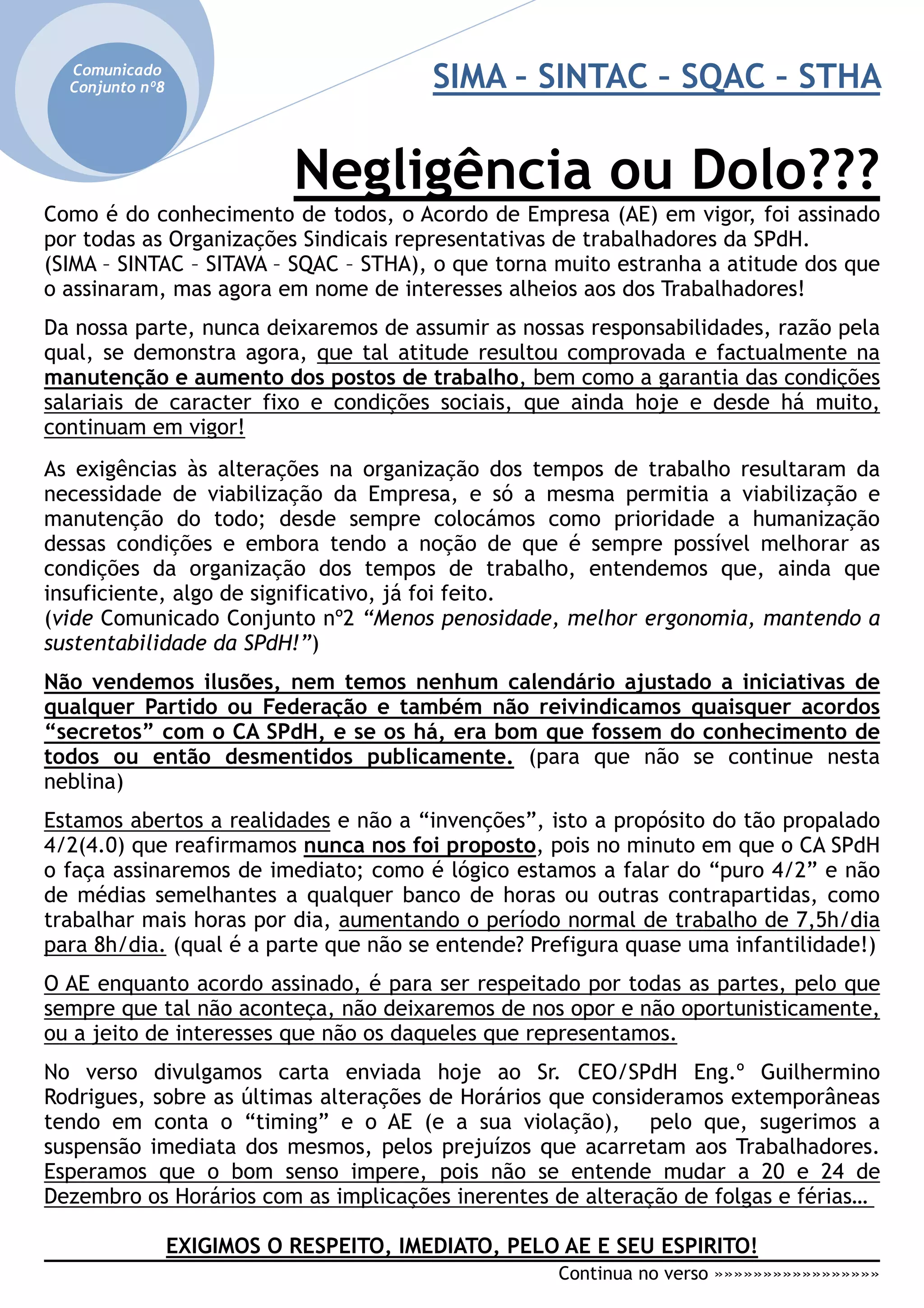 Este documento discute as alterações recentes nos horários de trabalho na empresa SPdH feitas em 20 e 24 de dezembro. As organizações sindicais signatárias do acordo de empresa criticam estas mudanças por acontecerem em período de Natal e fim de ano, afetando as folgas e férias dos trabalhadores. Elas pedem a suspensão imediata dos novos horários e o respeito pelo acordo de empresa.