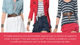 Este documento propõe uma estratégia de marketing multiplataforma para promover produtos e aumentar a visibilidade de uma marca, incluindo anúncios de rádio, publicações em redes sociais e blogs, com o objetivo de impactar um público da classe C economicamente ativo. A estratégia consiste em 25 anúncios de rádio, 09 toques ao vivo, 02 intervenções ao vivo, 02 posts no Twitter, 01 post no Facebook e 01 publieditorial em blog, durante um período de 5 dias.