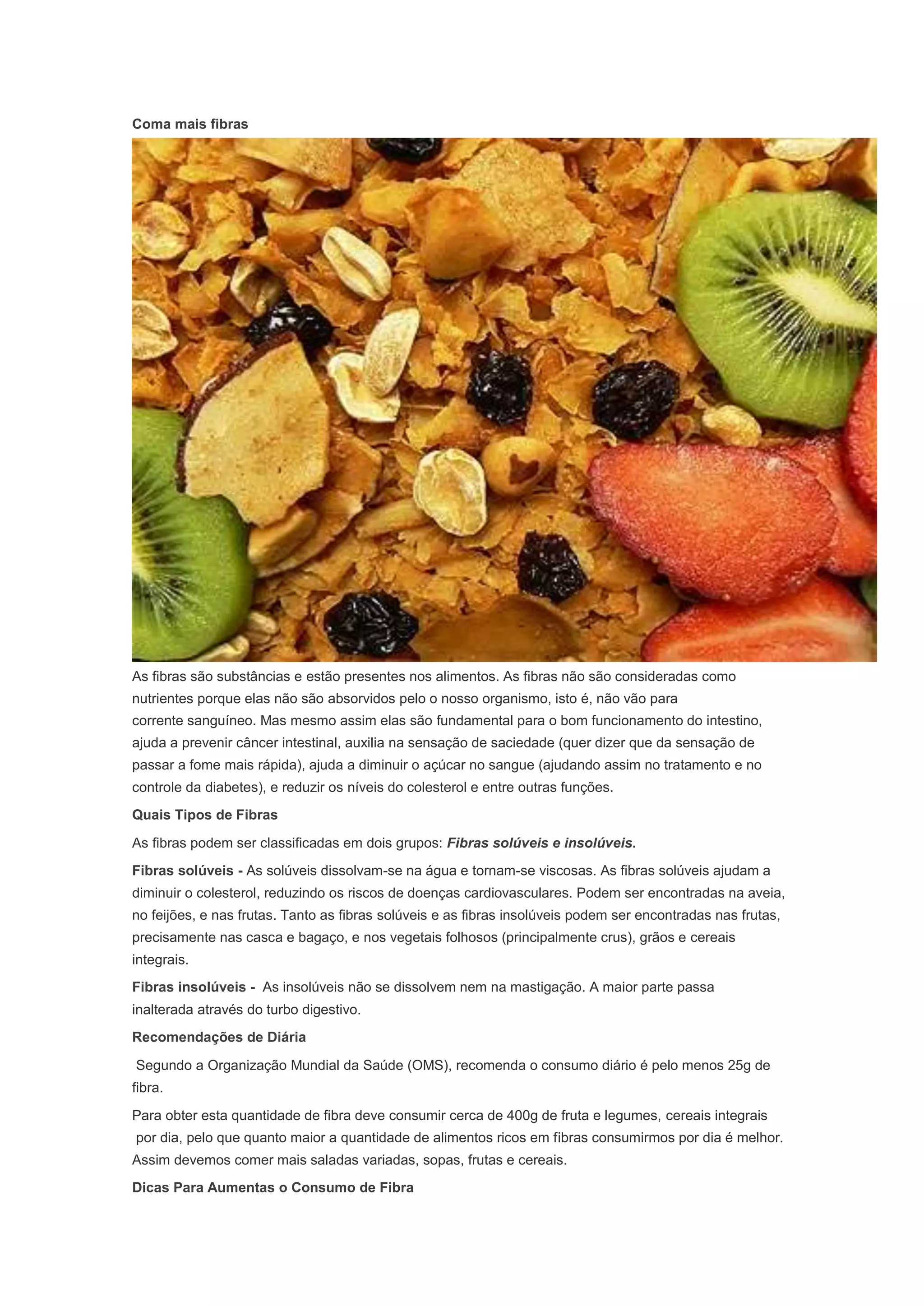 As fibras são substâncias presentes nos alimentos que não são absorvidas pelo organismo, mas são fundamentais para o bom funcionamento do intestino e trazem outros benefícios à saúde, como prevenir câncer e controlar a diabetes. Deve-se consumir pelo menos 25g de fibras por dia através de alimentos como frutas, legumes e cereais integrais para aproveitar seus efeitos.