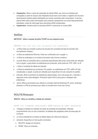 Este documento resume comandos de rede comuns no Windows, incluindo ping para testar conectividade, tracert para rastrear rotas, ipconfig para configurações de rede, e netstat para exibir estatísticas de rede. Ele também descreve comandos como arp, route, nbtstat e telnet.
