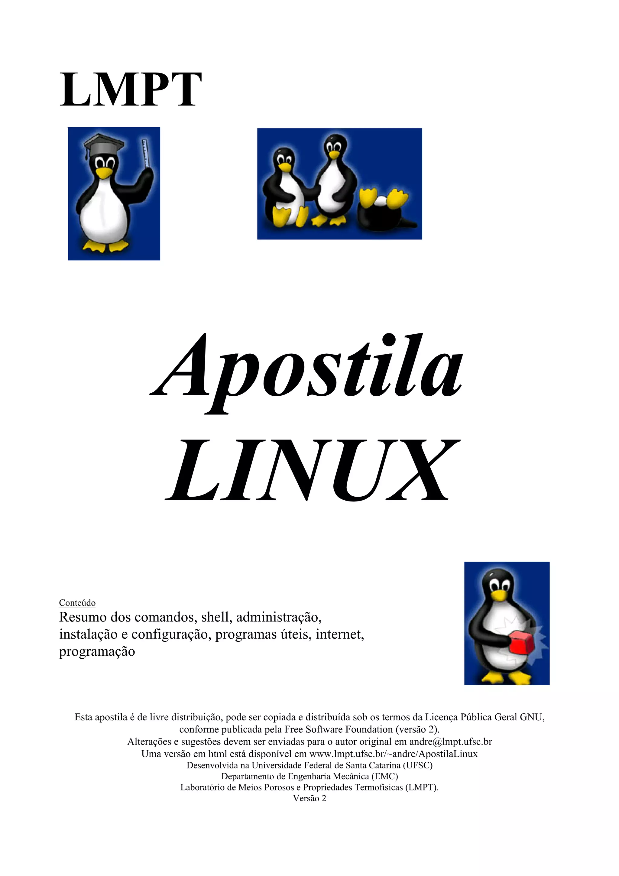 Este documento fornece um resumo dos principais comandos, administração e configuração do sistema Linux, incluindo a instalação de programas, ferramentas de rede e programação. Também aborda tópicos como instalação do sistema, configuração de hardware e modificação do kernel.