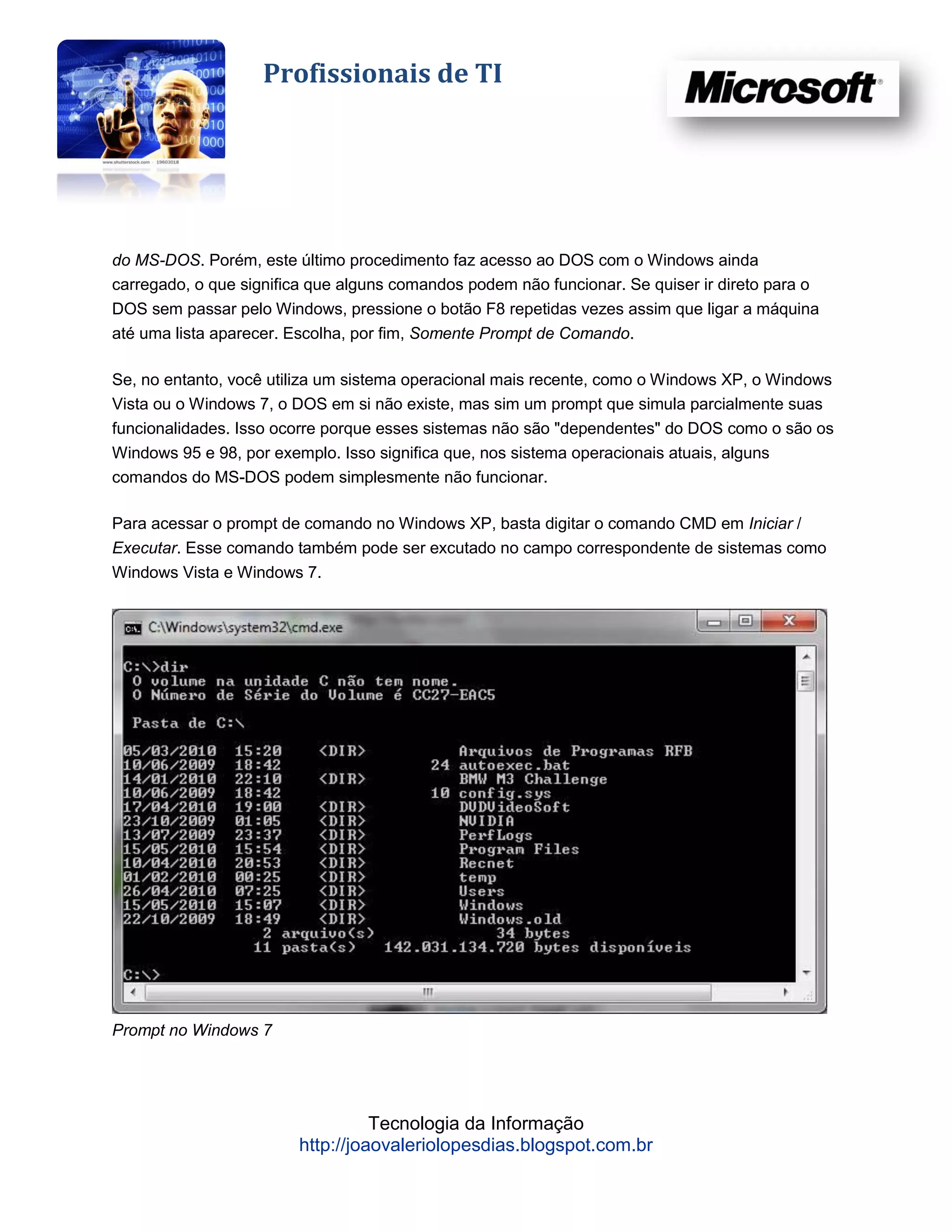 O documento descreve os principais comandos do sistema operacional MS-DOS, incluindo como acessá-lo, navegar entre diretórios, gerenciar arquivos e pastas, e formatar discos. Os comandos mais detalhados incluem DIR, CD, COPY, XCOPY, DEL, FORMAT e CHKDSK.