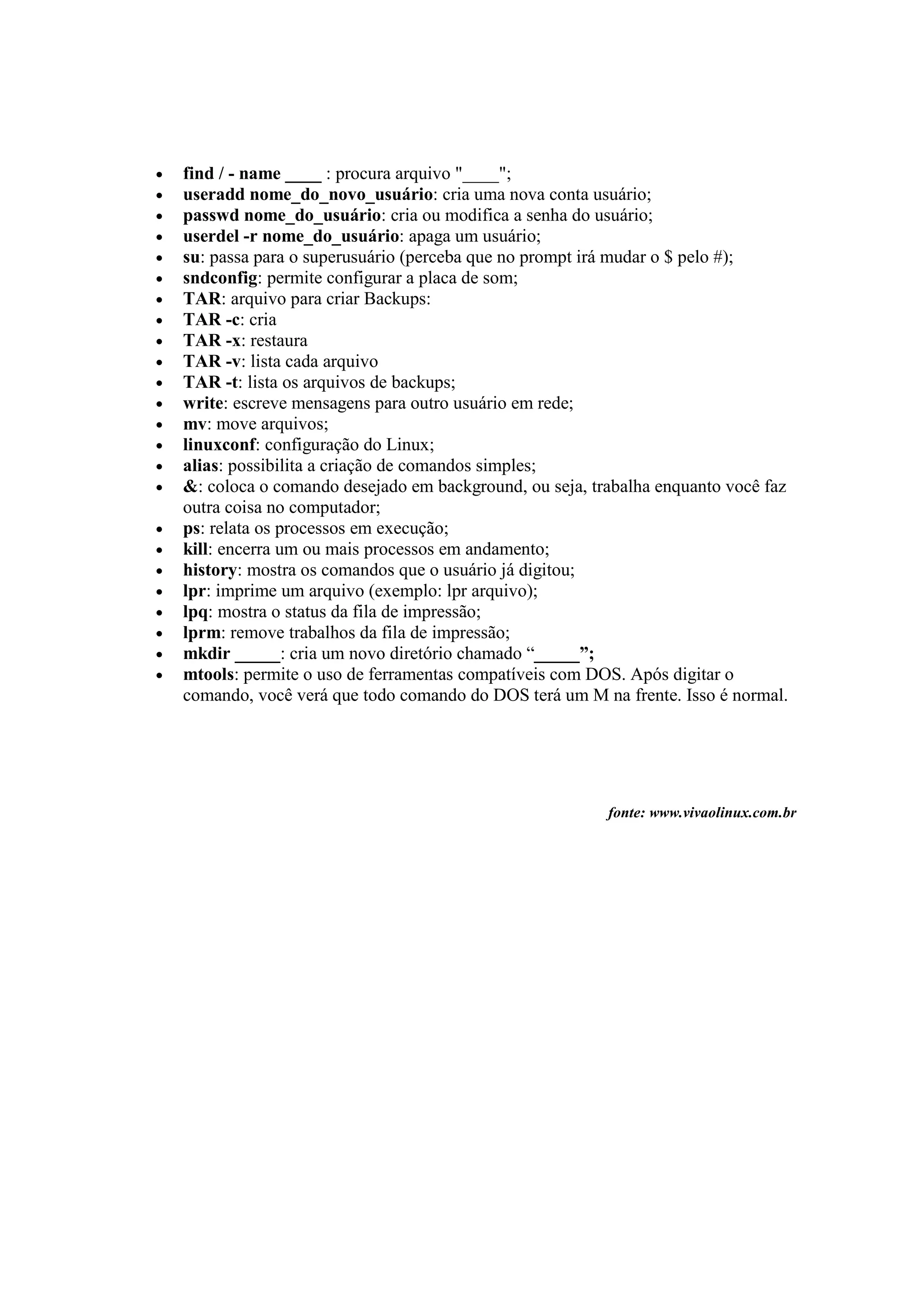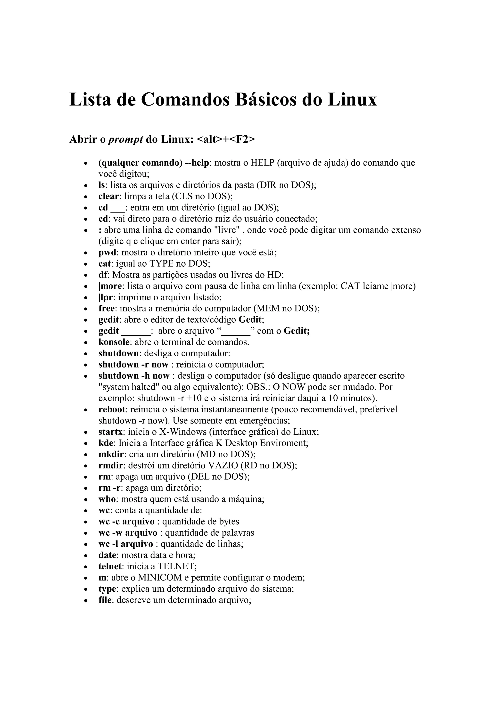 Este documento fornece uma lista de comandos básicos do Linux, incluindo comandos para navegar e gerenciar arquivos e diretórios (como ls, cd e rm), iniciar aplicativos (como gedit e konsole), gerenciar usuários e permissões (como useradd e passwd) e desligar ou reiniciar o sistema (como shutdown e reboot).