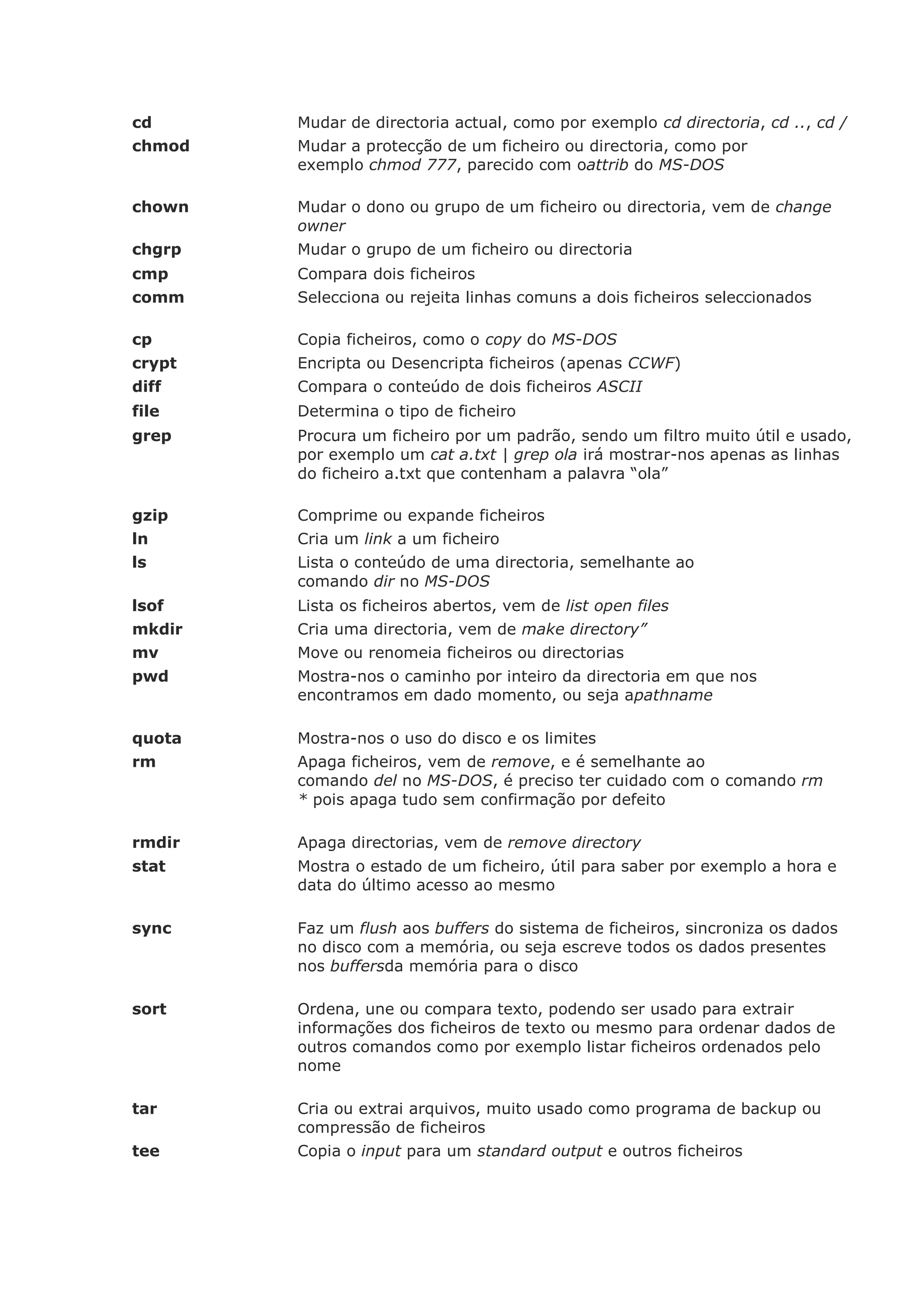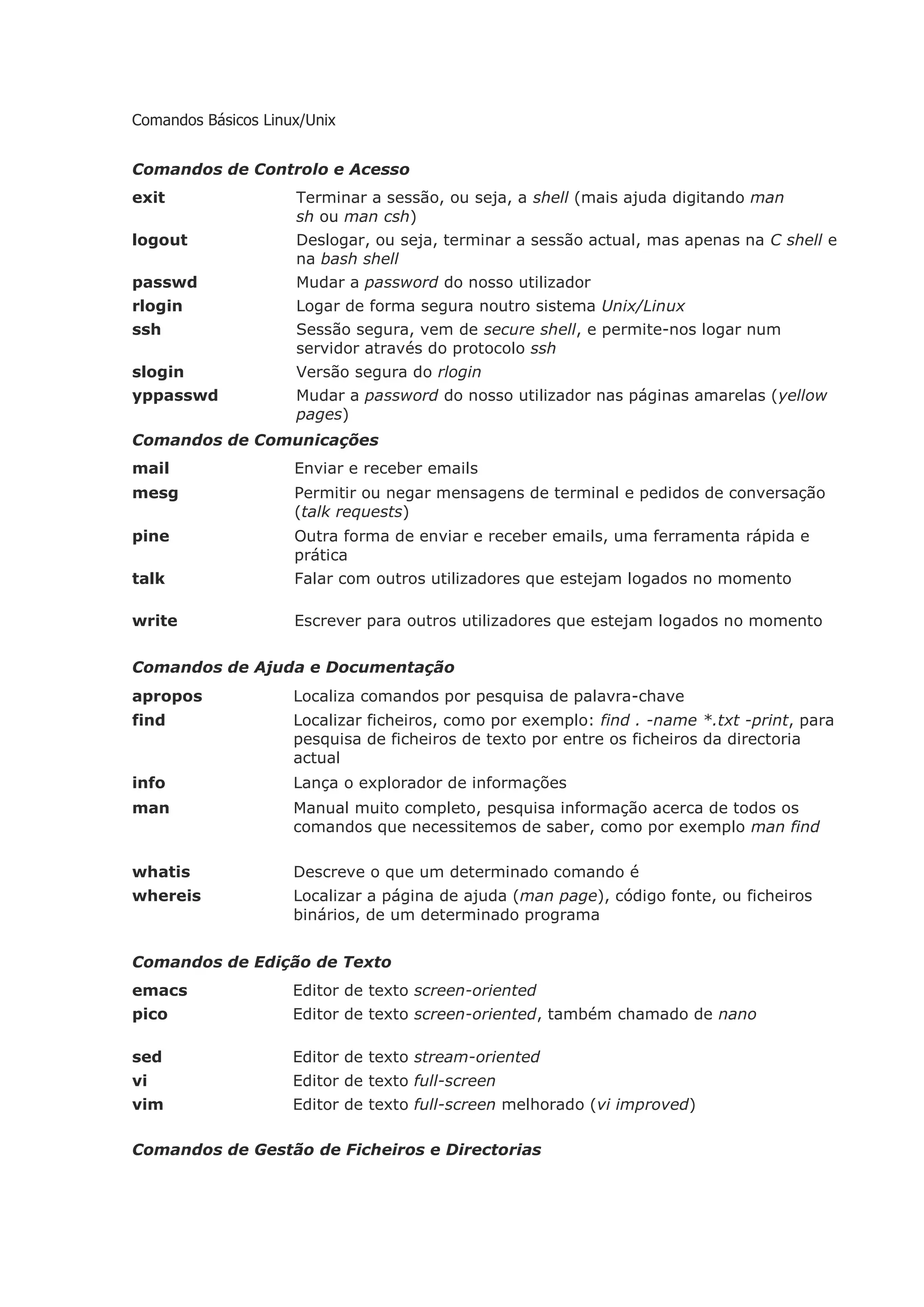 Este documento fornece uma lista extensa de comandos básicos do Linux/Unix, agrupados por função. Inclui comandos para controlo e acesso, comunicações, ajuda e documentação, edição de texto, gestão de ficheiros e directorias, exibição e impressão de ficheiros, transferência de ficheiros, controlo de processos, informação de estado, processamento de texto e navegação web. São descritos mais de 100 comandos diferentes.