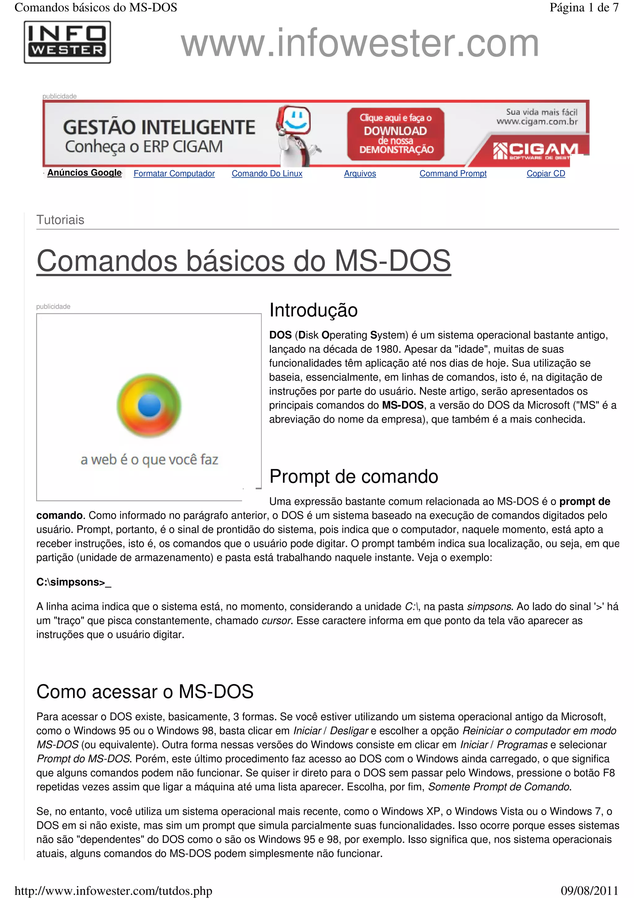 2) Os comandos básicos apresentados incluem DATE, TIME, DIR, MKDIR, COPY, FORMAT e DEL.