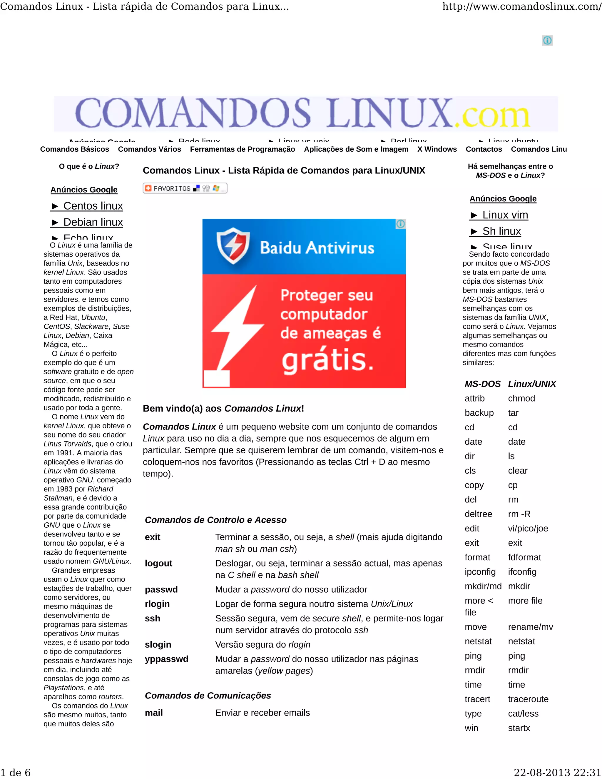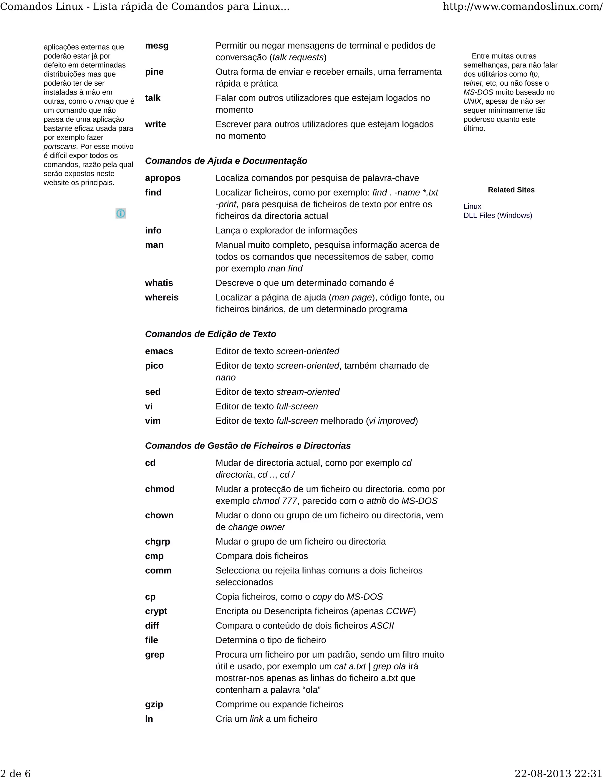 O documento fornece uma lista rápida de comandos Linux úteis para uso no dia a dia. A lista inclui comandos de controle e acesso, comunicações, ajuda e documentação, edição de texto, gestão de ficheiros e diretórios, exibição e impressão de ficheiros, transferência de ficheiros, notícias e rede, controle de processos, informação de estado e processamento de texto. Muitos comandos Linux têm funções semelhantes aos comandos MS-DOS, embora o Linux seja mais poderoso.