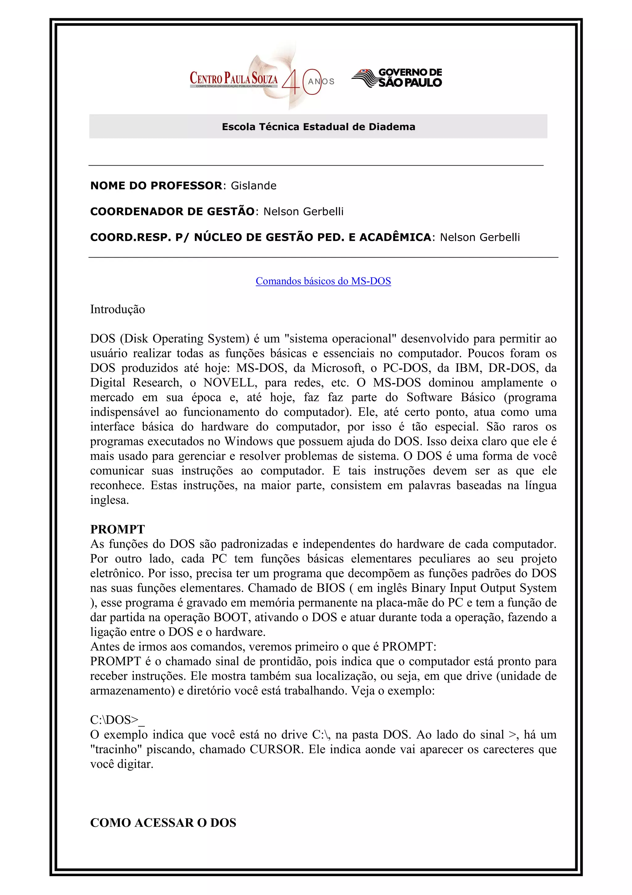 O documento fornece instruções sobre comandos básicos do MS-DOS, incluindo como acessar o DOS, data e hora, diretórios, arquivos e formatar discos. É dividido em seções sobre prompt, acesso ao DOS, comandos e suas funções.