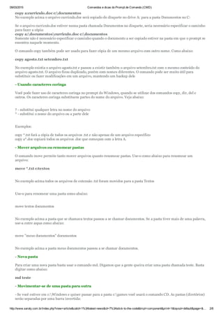 O documento fornece uma lista de comandos e dicas para uso do Prompt de Comando no Windows, incluindo como listar arquivos e pastas, copiar arquivos, usar caracteres coringa, mover arquivos e pastas, criar e remover pastas, renomear e deletar arquivos, e ajustar data e hora. Também lista alguns comandos avançados como bootcfg, defrag, diskpart e fsutil.
