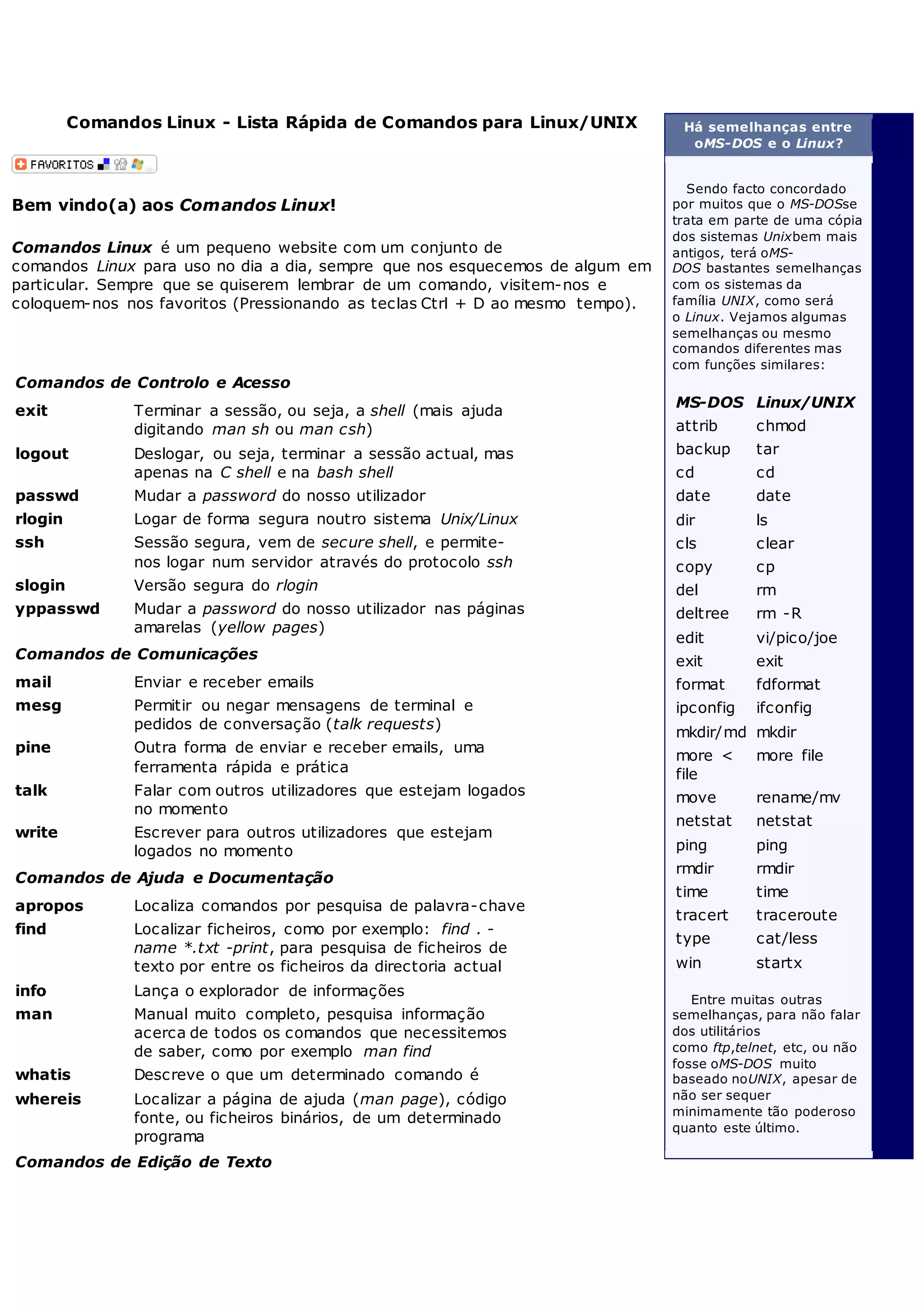 Este documento fornece uma lista detalhada de comandos Linux comuns, organizados por categoria de função. Inclui comandos para controle de sessão, comunicação, edição de texto, gestão de arquivos, transferência de arquivos, controle de processos e muito mais. O objetivo é servir como guia rápido de referência para os usuários lembrarem os comandos Linux.
