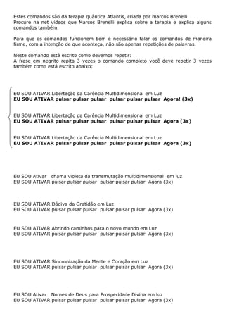 Este documento apresenta comandos da terapia quântica Atlantis criada por Marcos Brenelli. Os comandos devem ser falados de maneira firme com intenção para que aconteçam, não apenas repetições de palavras. São listados vários comandos para ativar libertação da carência, transmutação, gratidão, prosperidade entre outros, sempre repetidos três vezes.