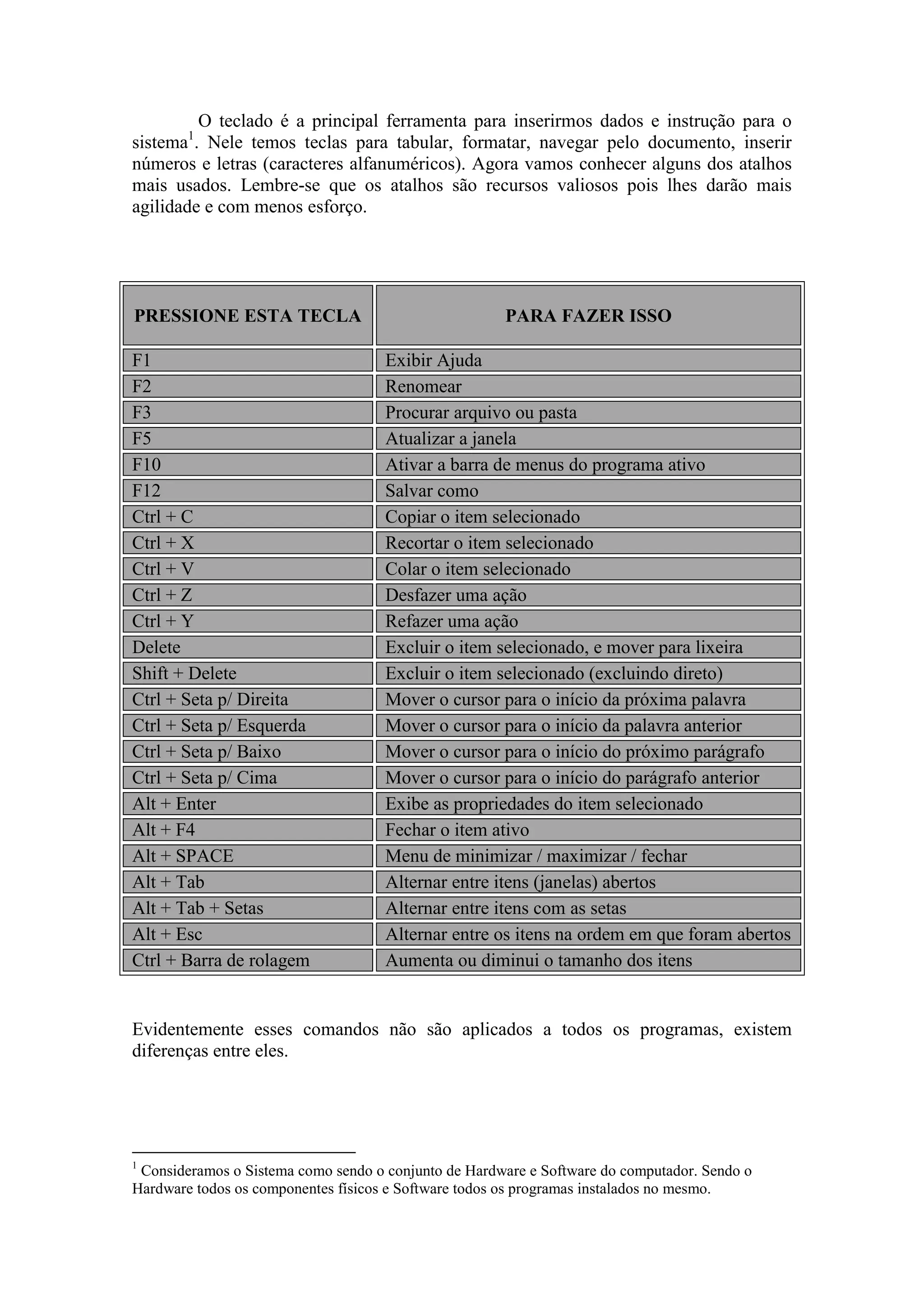 O documento lista atalhos de teclado comuns para navegar e editar documentos, incluindo combinações de teclas como Ctrl+C para copiar, Ctrl+V para colar e Windows+D para mostrar a área de trabalho. Ele também explica que os atalhos podem tornar o trabalho mais rápido e eficiente ao requerer menos esforço do que usar o mouse.