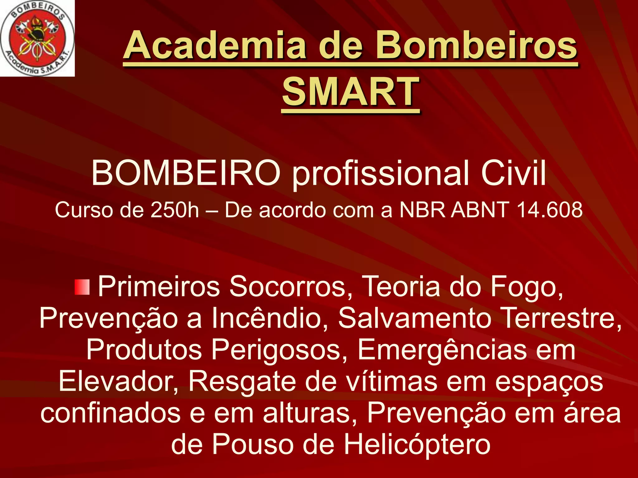 O documento descreve um curso de bombeiro civil de 250 horas que ensina primeiros socorros, combate a incêndio, resgate de vítimas, prevenção de incêndios e emergências. O curso inclui treinamento teórico e prático em simuladores e situações reais para preparar os alunos para atuarem em locais como hospitais, indústrias e prédios.