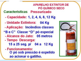O documento fornece informações sobre extintores de incêndio de pó químico seco, incluindo sua história, tipos, agentes extintores, classes de incêndio e uso. O capitão George Manby inventou o primeiro extintor de incêndio automático em 1816 para combater incêndios em alturas onde mangueiras não alcançavam. Extintores de pó químico seco podem ser usados em todas as classes de incêndio e contêm agentes como bicarbonato de sódio ou potássio.