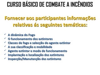 O documento fornece informações sobre combate a incêndios, incluindo a dinâmica do fogo, classes de fogo, tipos de extintores, como utilizá-los e manter sua operacionalidade. Explica o triângulo e tetraedro do fogo, os requisitos para a combustão, e detalha os principais tipos de extintores, suas aplicações, localização e manutenção.