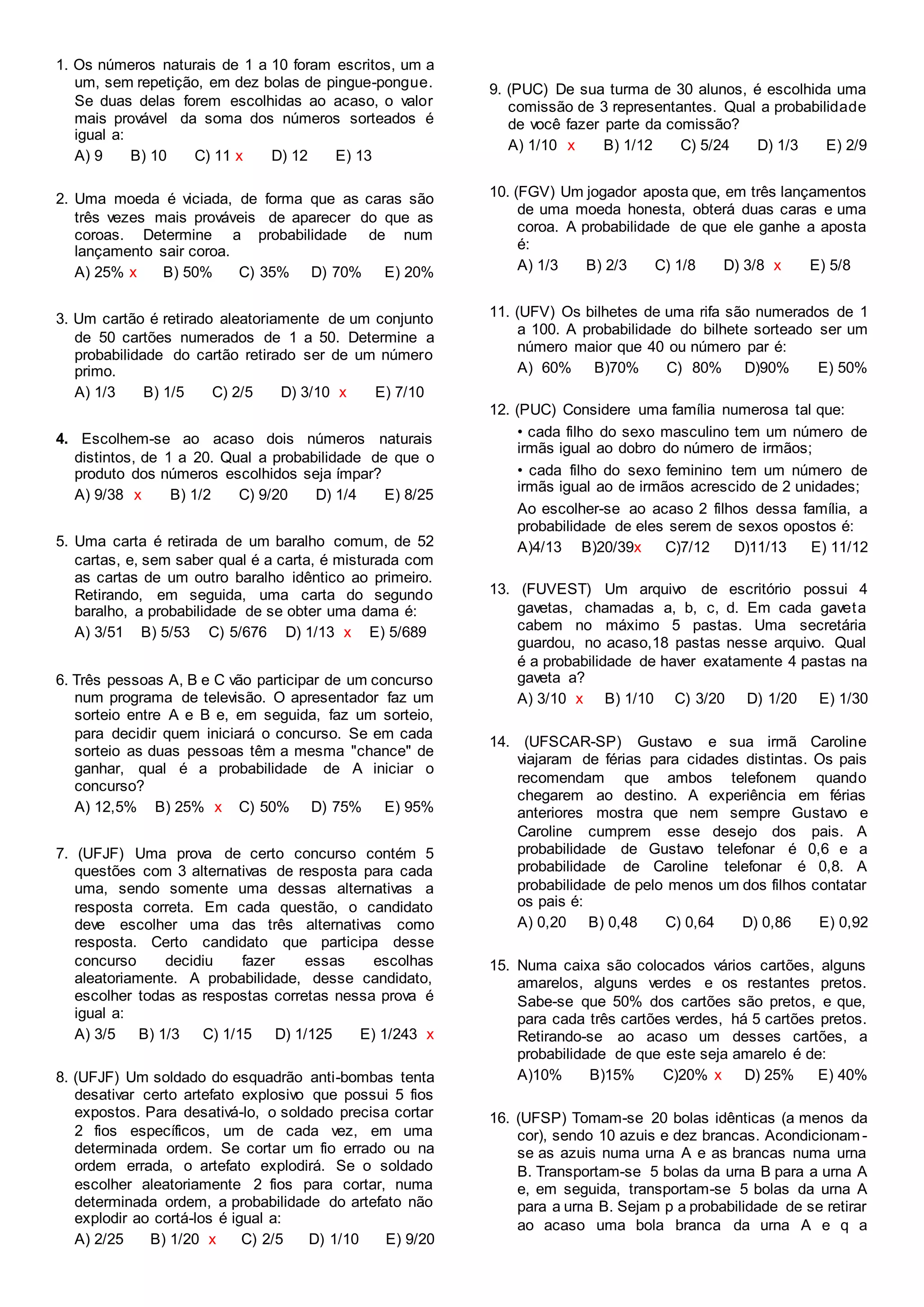 1. O documento contém 32 problemas de probabilidade sobre diversos temas como sorteios aleatórios, jogos de azar e experimentos.