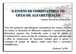 O documento aborda a importância do ensino de combinatória e probabilidade nos primeiros anos escolares, enfatizando a necessidade de superar a simples contagem e desenvolver estratégias mais complexas. Apresenta os quatro principais tipos de problemas combinatórios (arranjo, combinação, permutação e produto cartesiano) e discute as dificuldades enfrentadas por alunos nas etapas iniciais do aprendizado. A pesquisa destaca que, com o ensino adequado, as crianças podem entender e aplicar conceitos de combinatória de forma gradual e eficaz.
