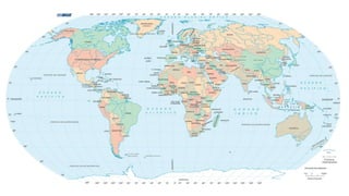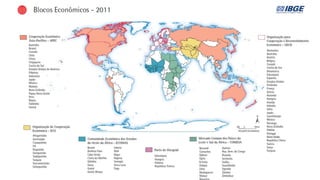 O documento descreve a evolução histórica da divisão internacional do trabalho e do comércio mundial, desde as colônias até os blocos econômicos atuais. Apresenta as classificações de países desenvolvidos e em desenvolvimento ao longo do século 20 e explica as principais instituições e acordos comerciais globais, como a OMC e a Rodada do Uruguai. Também define os principais blocos econômicos atuais, incluindo a UE, NAFTA, Mercosul, APEC e G20.
