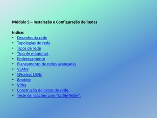 Este documento resume os principais tópicos sobre instalação e configuração de redes, incluindo desenho da rede, topologias de rede, tipos de rede, endereçamento de IP, planejamento avançado de redes, VLANs, wireless LANs, routing, VPNs e construção de cabos de rede.