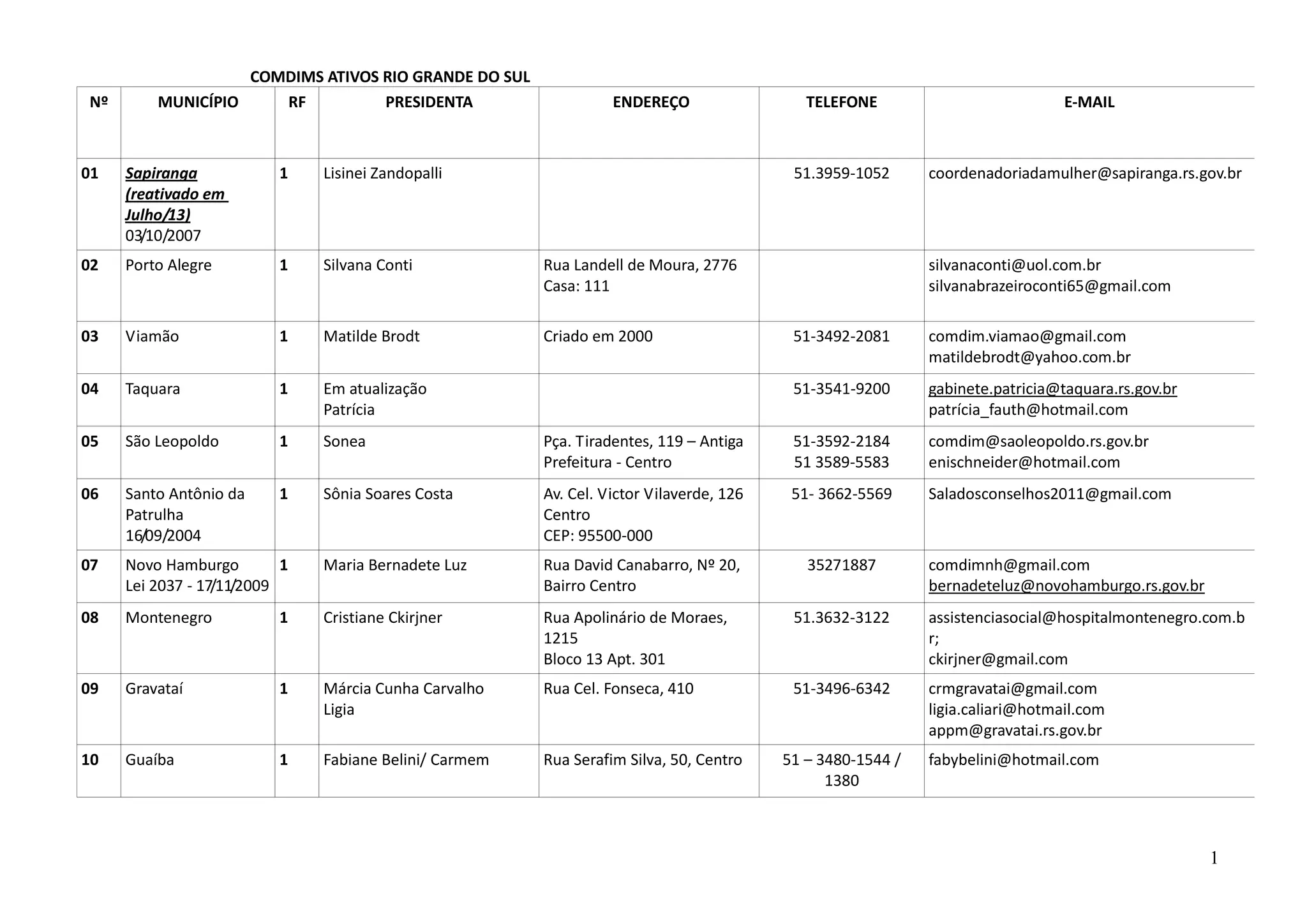 Este documento lista 66 municípios do Rio Grande do Sul que possuem Conselhos Municipais dos Direitos da Mulher, fornecendo informações como nome do responsável, endereço e contato de cada um.