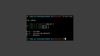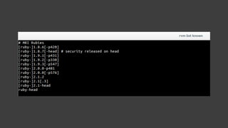 O documento apresenta uma introdução ao Ruby, incluindo sua história, propósito, características e conceitos fundamentais como orientação a objetos, tipagem dinâmica, duck typing e classes. Também mostra como instalar o Ruby e gerenciador de versões RVM, e exemplos básicos de uso de strings, arrays, hashes, classes, módulos e herança.