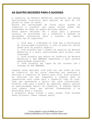 O documento discute as quatro decisões essenciais para o sucesso no marketing de rede, como ter seu próprio negócio é o caminho para a liberdade financeira, e como os princípios do marketing de rede são superiores aos negócios tradicionais.