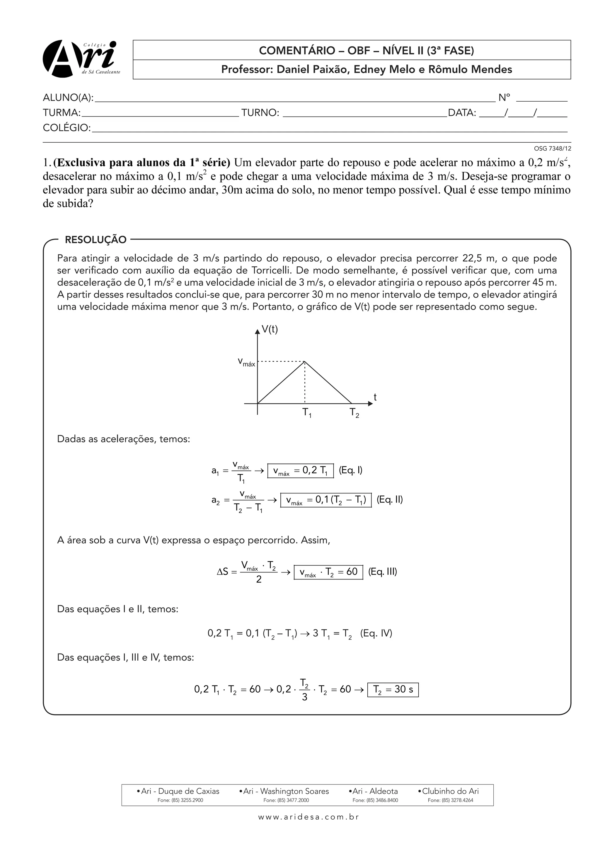 O documento apresenta resoluções de diversos problemas de física. A primeira resolução trata da velocidade máxima de um elevador para percorrer 30m no menor tempo possível. A segunda resolução analisa a colisão elástica entre duas esferas. A terceira resolução calcula a frequência de rotação de polias acopladas com raios e velocidades diferentes.