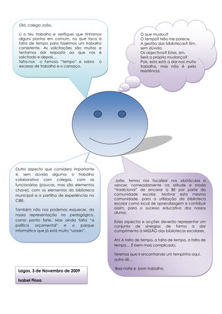 A carta discute vários desafios enfrentados pelas bibliotecas escolares, incluindo falta de tempo, recursos limitados e atitudes tradicionais da comunidade escolar. Sugere que a colaboração, foco nos obstáculos e motivação dos alunos podem ajudar a cumprir a missão das bibliotecas.