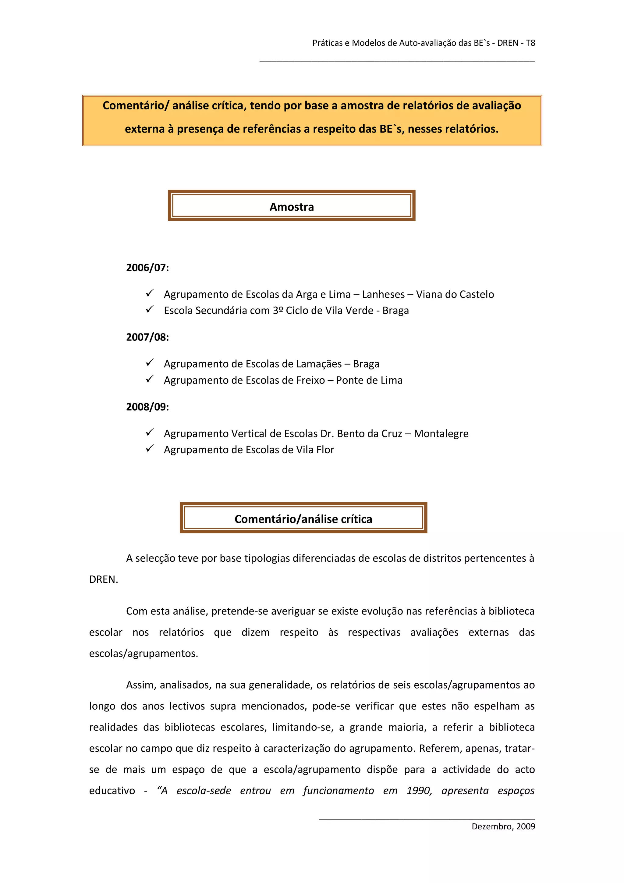 Este documento analisa relatórios de avaliação externa de 6 escolas/agrupamentos entre 2006-2009, encontrando referências à biblioteca escolar limitadas à caracterização do agrupamento. A biblioteca não é considerada no processo de avaliação ou no seu contributo para as aprendizagens dos alunos. É necessário objetivar o trabalho realizado e o impacto das bibliotecas escolares.
