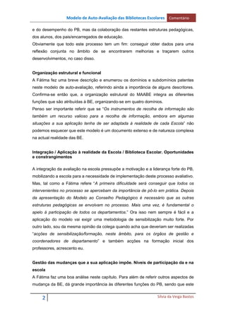 Este documento resume o trabalho de Fátima sobre a pertinência de um Modelo de Avaliação para Bibliotecas Escolares. Fátima argumenta que a avaliação é importante para identificar pontos fortes e fracos e melhorar o sucesso educativo, e que as bibliotecas escolares podem contribuir para este processo. No entanto, a recolha de evidências para a avaliação é morosa e depende da colaboração de terceiros. O documento também discute os desafios na implementação do modelo, incluindo a necessidade de sensibilizar e en