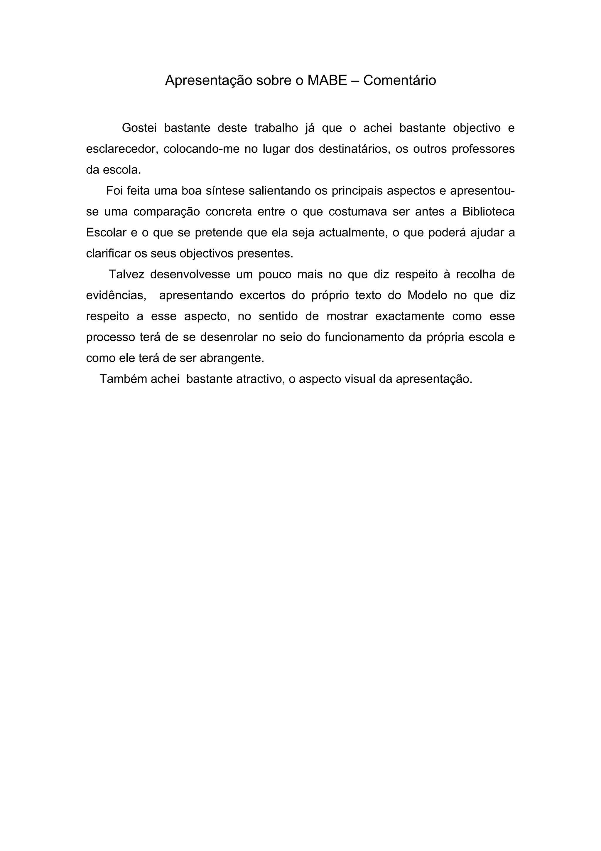 O documento apresenta um comentário sobre uma apresentação do MABE (Modelo de Avaliação da Biblioteca Escolar). Resume os principais pontos da apresentação, que comparou de forma concreta o que era a biblioteca antes e o que se pretende que seja agora, esclarecendo seus objetivos atuais. Sugere que desenvolva mais sobre a recolha de evidências, mostrando excertos do texto sobre como esse processo ocorrerá na escola de forma abrangente.
