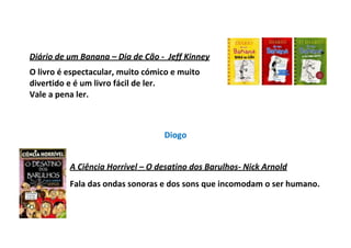 Os alunos comentam vários livros que leram recentemente, incluindo histórias, banda desenhada, diários e livros sobre ciência. Alguns destacam capítulos ou personagens específicos que gostaram, e muitos recomendam os livros por serem interessantes e de fácil leitura.